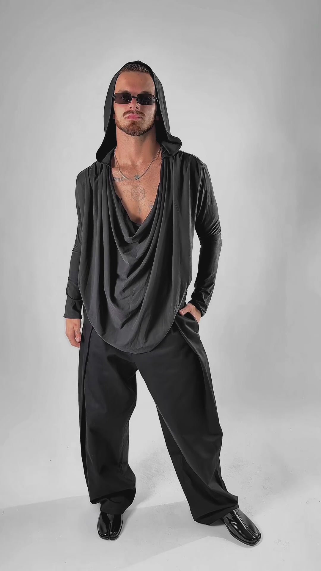 Black hooded blouse with a water neckline