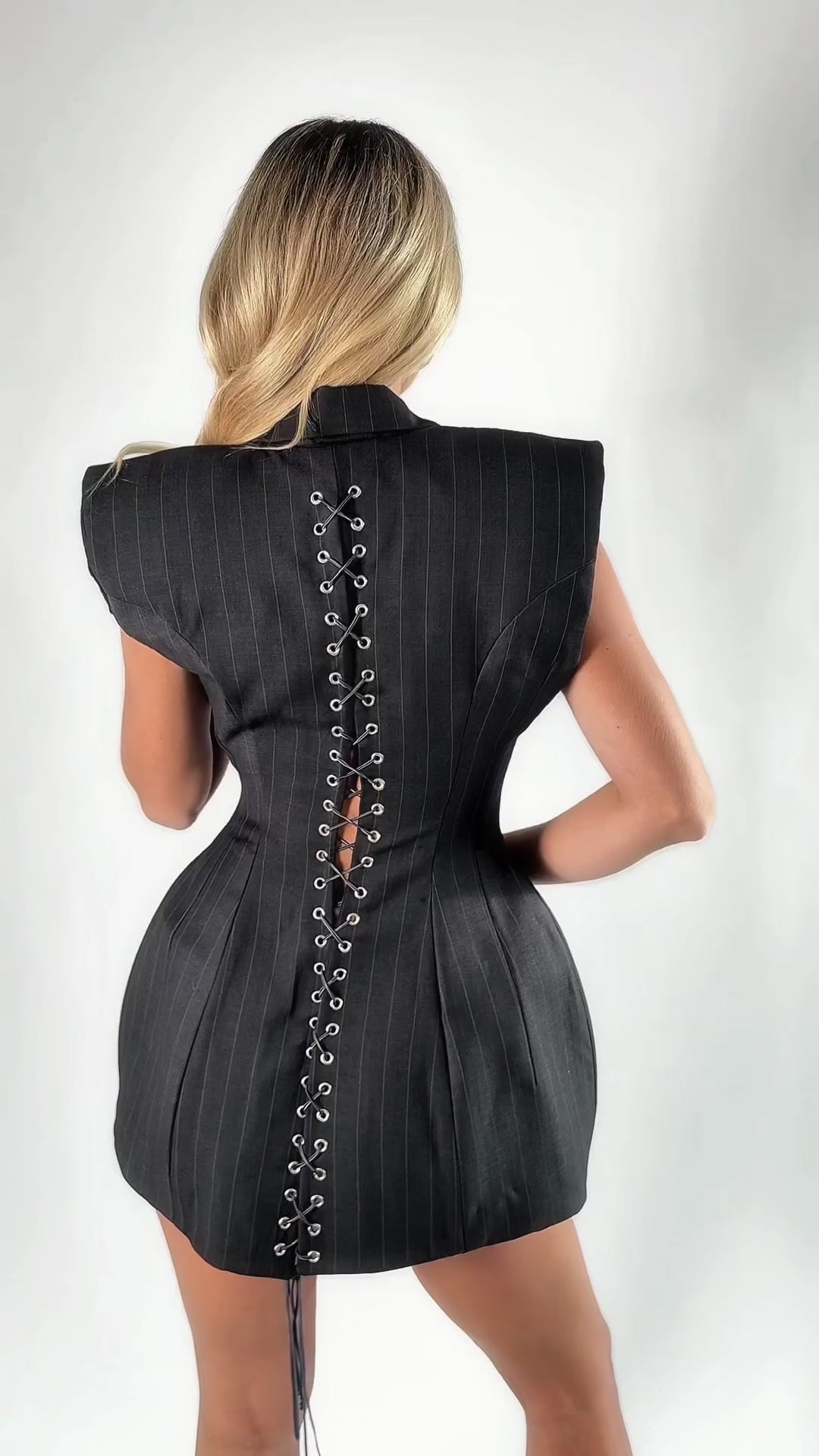 An elegant graphite mini dress crafted from 100% wool. The built-in bodice with underwires beautifully accentuates the waist, while the lace-up back adds character. The dress combines classic pinstripe with a modern, bold cut. Perfect for evenings out and special occasions.